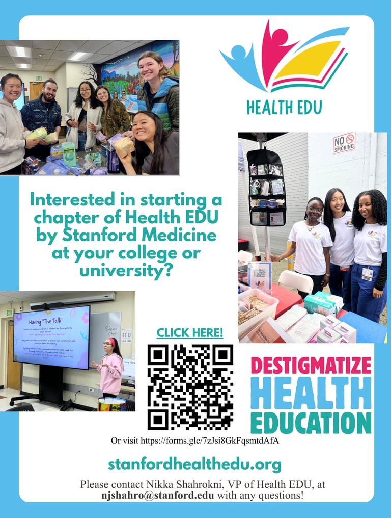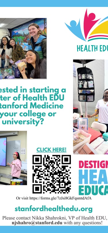All Chapter Founders receive structured onboarding, leadership training, and ongoing mentorship from Health EDU’s leadership team centralized at Stanford Medicine. This includes regular check-ins, access to updated materials, guidance on community partnerships, and support with program planning.